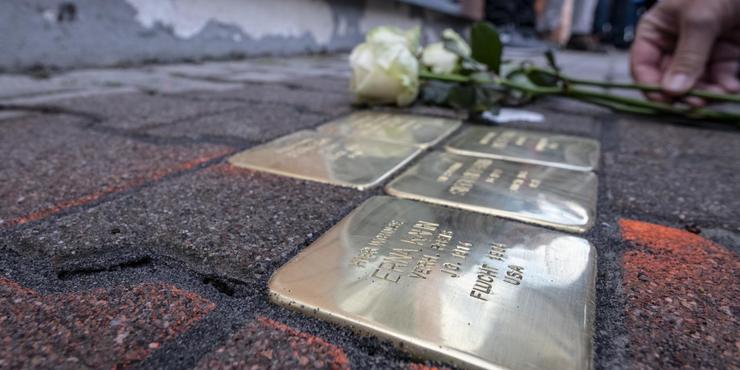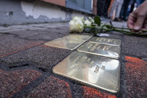 Mit Gedenksteinen, die jetzt im Bürgersteig der Bahnstraßeliegen, erinnern Stadt Riedstadt und Förderverein für jüdische Geschichte an die Familien Kahn und Sternfels.